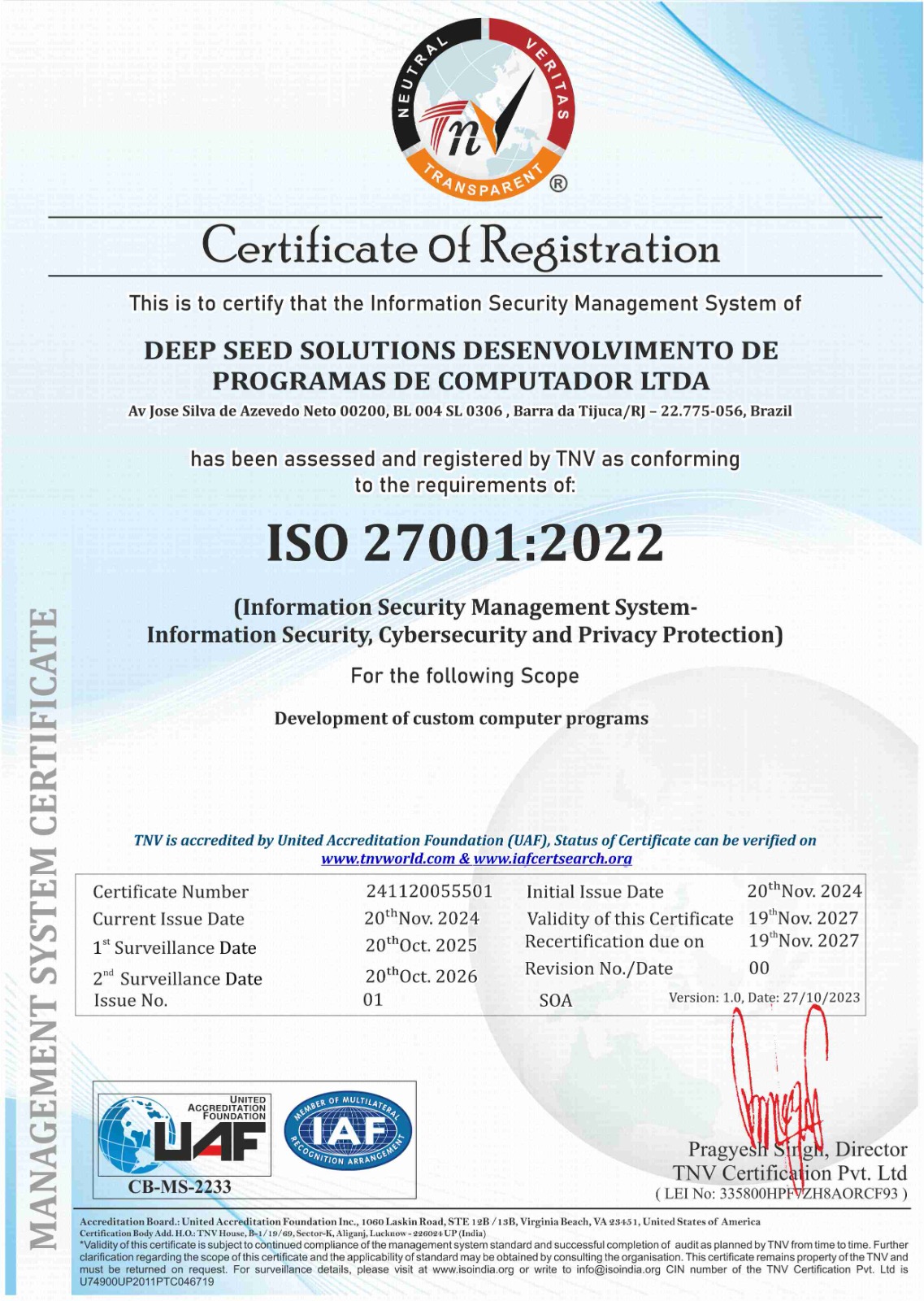 In 2024, Deep Seed Solutions reinforced its innovative position in the energy industry. We were honored to receive two prestigious awards for our Expert System FLOCO®: the Brazilian National Petroleum Agency (ANP) Technological Innovation Award (“Prêmio ANP de Inovação Tecnológica”) in the technology adoption ("Adoção Tecnológica") category and the SPE Subsea Award for Best Digitalization Initiative in Subsea. Additionally, we achieved ISO 27001:2022 certification, a globally recognized standard for information security management highlighting our commitment to secure data handling.